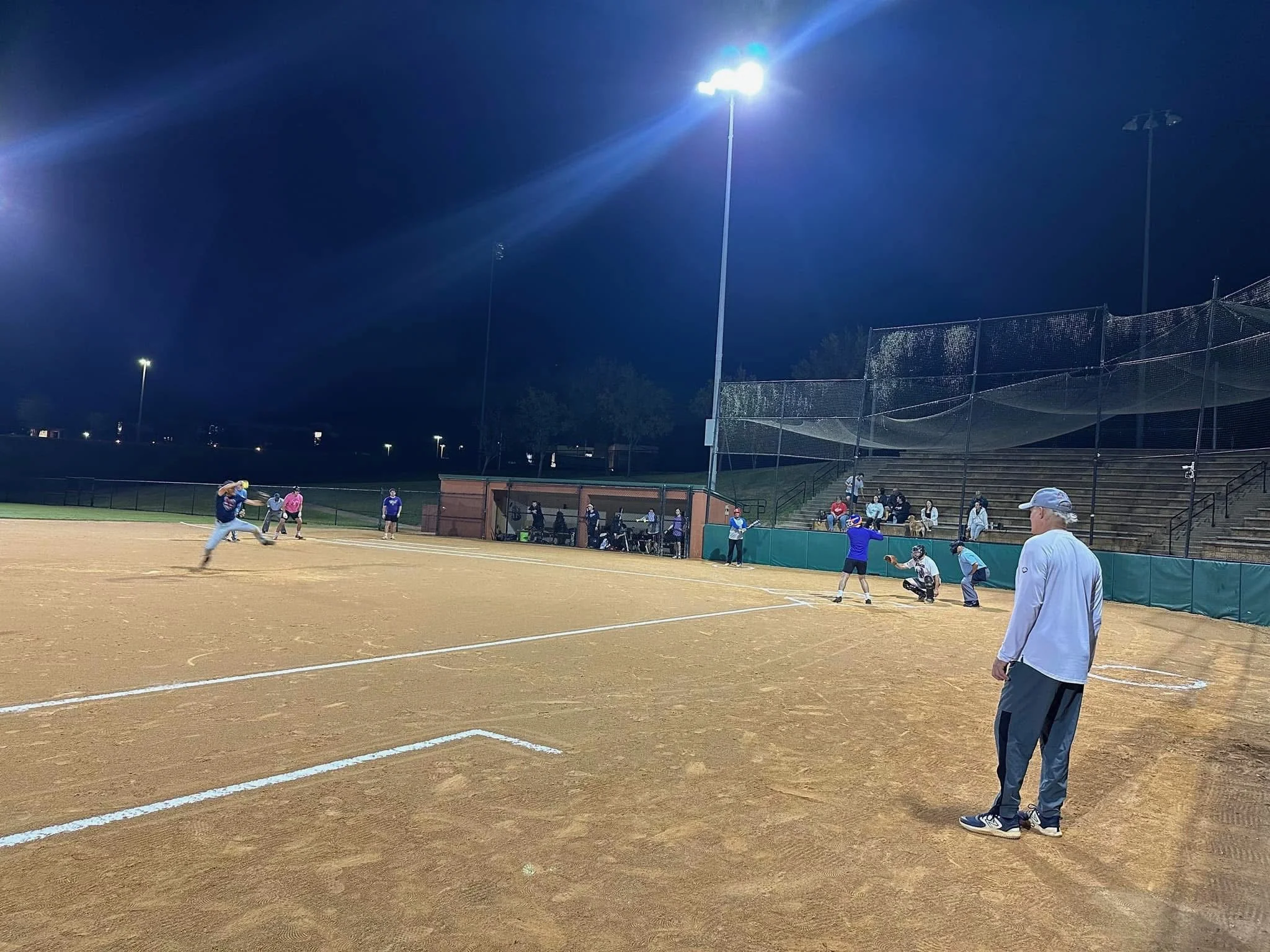 Coach Dennis Seymour leads his team to victory at the 2024 Co-Ed Fastpitch League Game #6